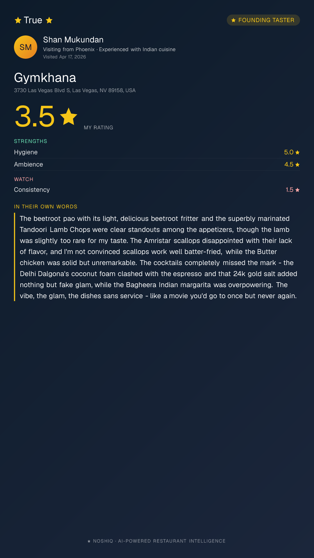 The beetroot pao with its light, delicious beetroot fritter and the superbly marinated Tandoori Lamb Chops were clear standouts among the appetizers, though the lamb was slightly too rare for my taste. The Amristar scallops disappointed with their lack of flavor, and I'm not convinced scallops work well batter-fried, while the Butter chicken was solid but unremarkable. The cocktails completely missed the mark - the Delhi Dalgona's coconut foam clashed with the espresso and that 24k gold salt added nothing but fake glam, while the Bagheera Indian margarita was overpowering. The vibe, the glam, the dishes sans service - like a movie you'd go to once but never again.